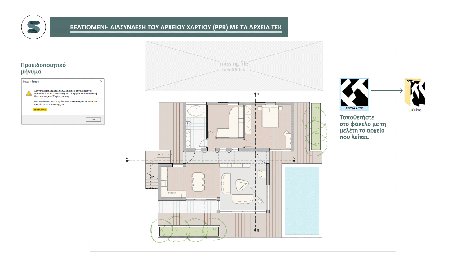 Όταν ανοίγετε τα «Χαρτιά» εκτύπωσης της μελέτης, το Tekton εντοπίζει αυτόματα τα συνδεδεμένα αρχεία και σας ειδοποιεί αν κάποιο δεν βρεθεί, ώστε να αποκαθιστάτε άμεσα τα σπασμένα links.