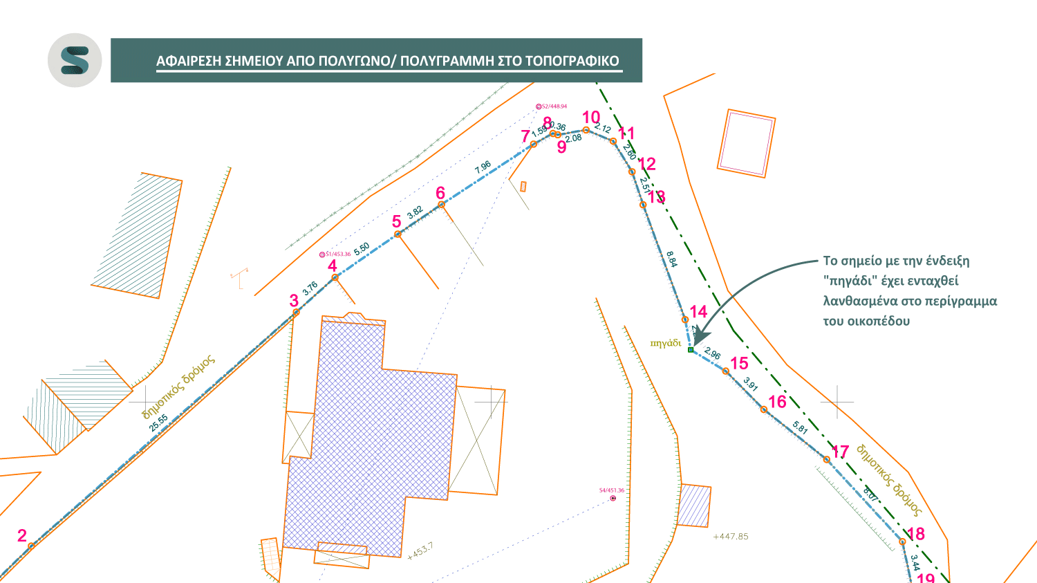 Το σημείο που αφαιρείται παραμένει στην κάτοψη ώστε να το διαγράψετε ή να το εντάξετε σε άλλη πολυγραμμή ή πολύγωνο. Ιδανικό εργαλείο για διορθώσεις σε αποτυπώσεις οικοπέδων, ρυμοτομικές γραμμές και όρια ιδιοκτησίας.