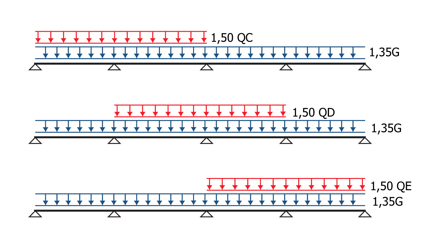 Οι φορτίσεις QC, QD, QE παράγονται από την εναλλάξ φόρτιση δύο συνεχόμενων ανοιγμάτων με το μεταβλητό φορτίο σχεδιασμού βάσει της EC2-1-1 §5.1.3(1)Α(a) ή EC3-1-1 παράρτ. ΑΒ.2(1)Β(α), ώστε να προκύψει η κρίσιμη εντατική κατάσταση στην στήριξη (αρνητικές ροπές) της δοκού.