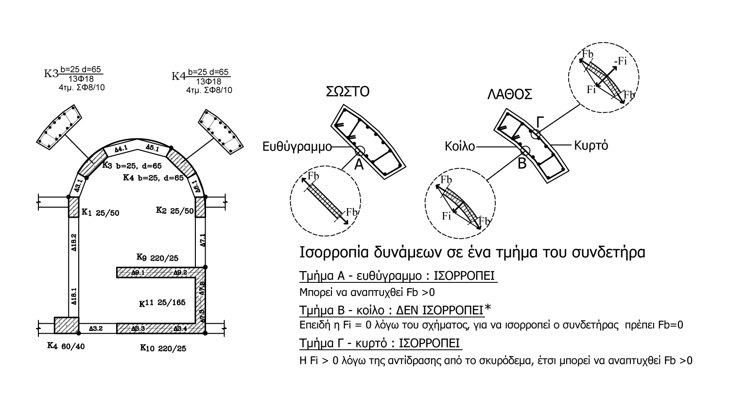 - Στο κυρτό τμήμα Γ η συνισταμένη των δυνάμεων Fi εξισορροπείται από την –Fi η οποία αναπτύσσεται ως αντίδραση από το σκυροδέμα.