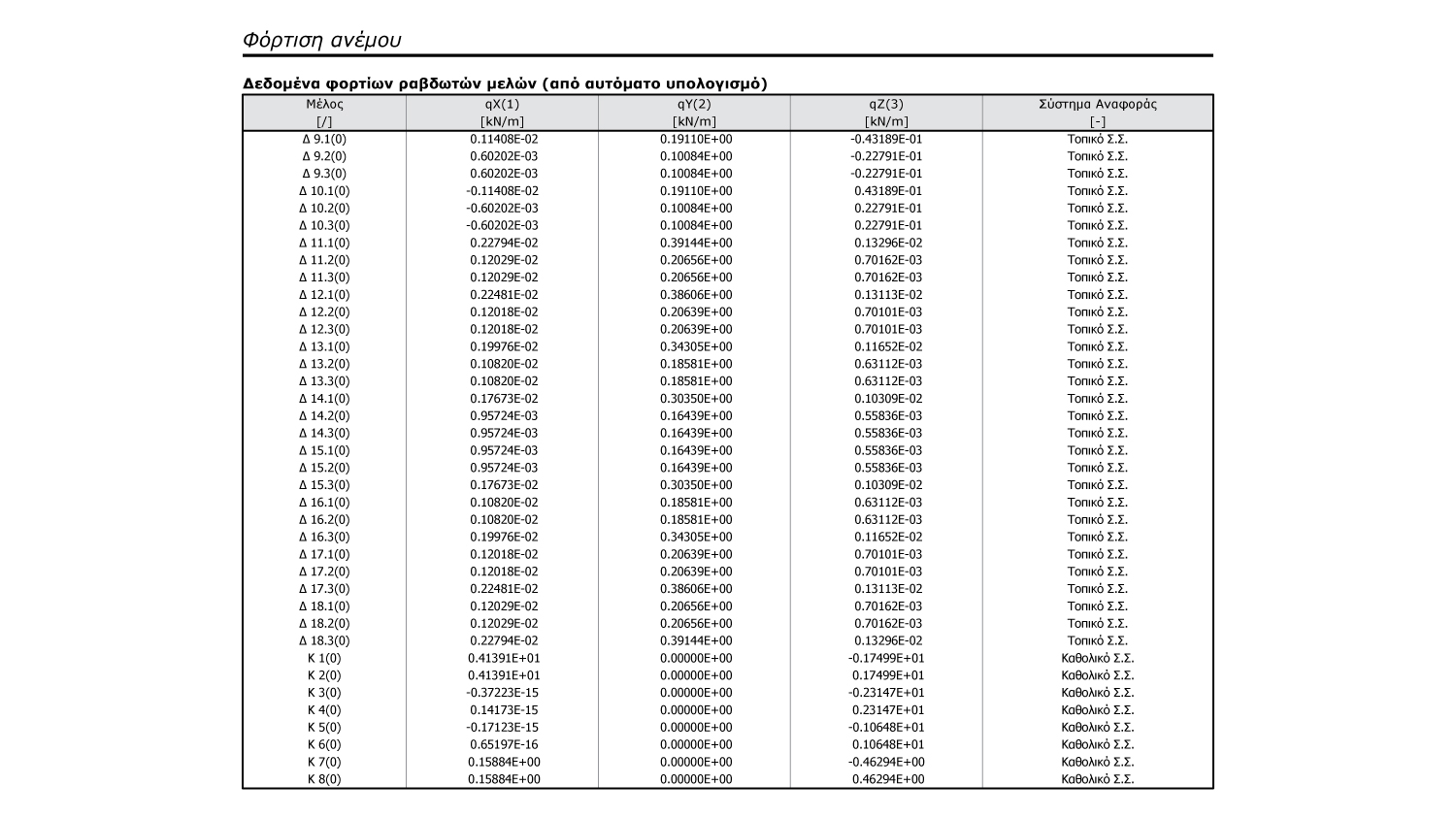 Στο Tεύχος, εάν επιλεγεί «Επίλυση > Αποτελέσματα > Λεπτομέρεια αποτελεσμάτων επίλυσης χωρικού = Εκτεταμένη», είναι δυνατή η επισκόπηση των κατανεμημένων φορτίων ανέμου όλων των μελών ανά φόρτιση.