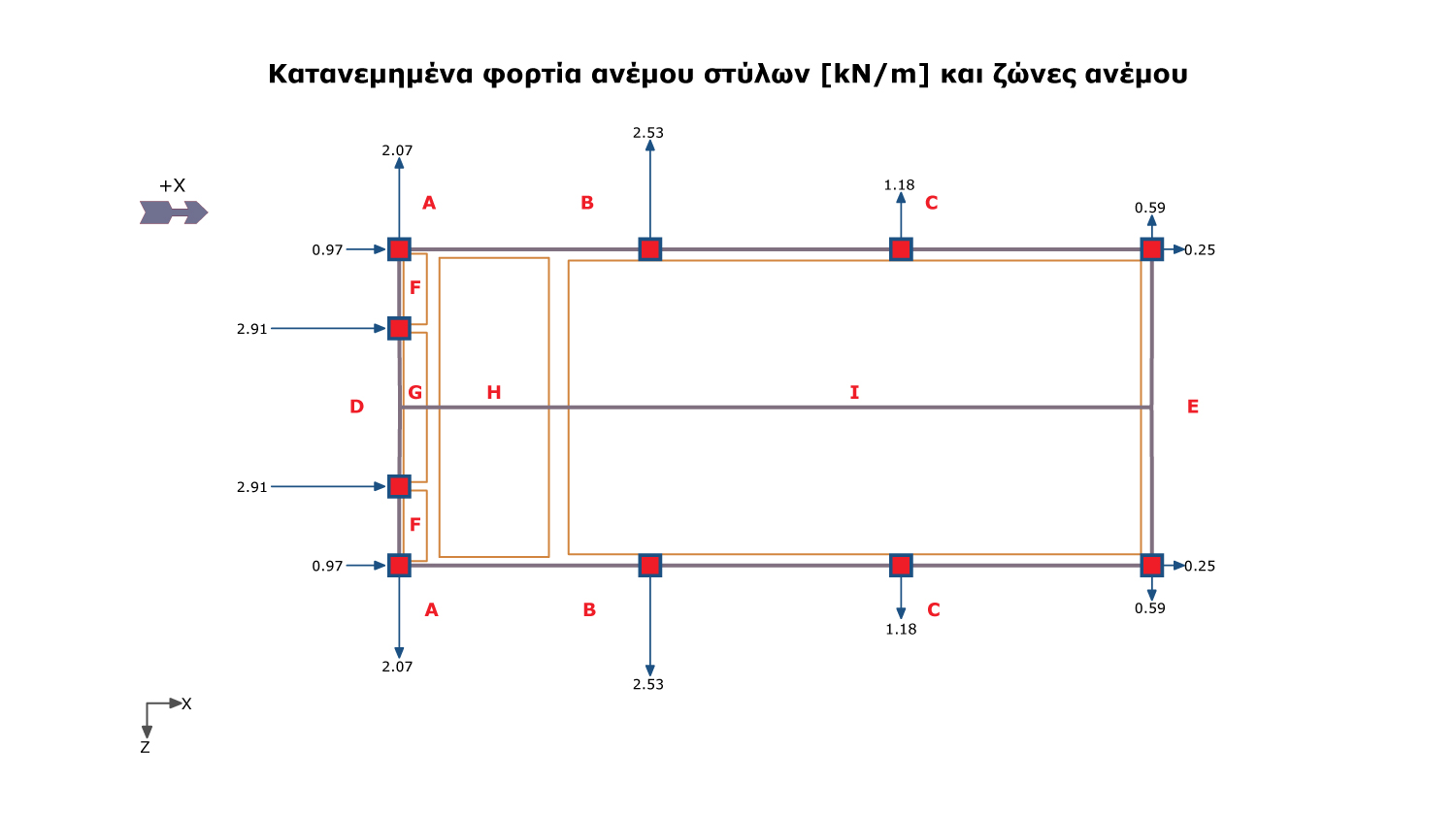 Με την εντολή «Παραγωγή συνδυασμών δράσεων» των «Παραγωγών», για κάθε περίπτωση φόρτισης (W+x, W-x, W+z, W-z) φορτίζονται τα υποστυλώματα και οι δοκοί, για τις οποίες έχει δοθεί «Παραλαβή φορτίων ανέμου = Ναι».