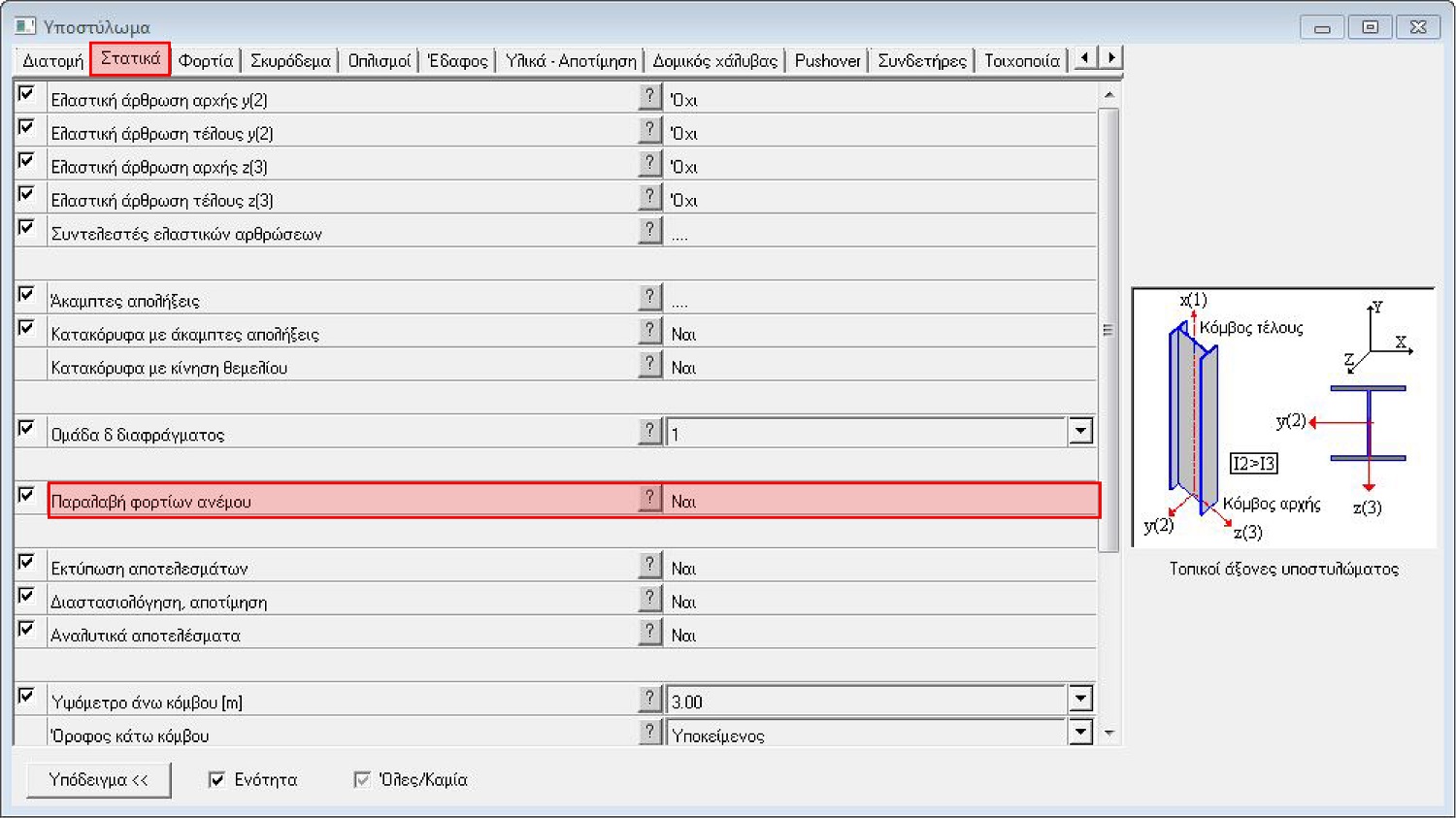 Εικόνα 1: Δώστε την παράμετρο «Δοκός > Στατικά > Παραλαβή φορτίων ανέμου (στέγη) = Ναι» μόνο στις τεγίδες. Η παράμετρος για τα γενικά μέλη είναι στο «Όχι».