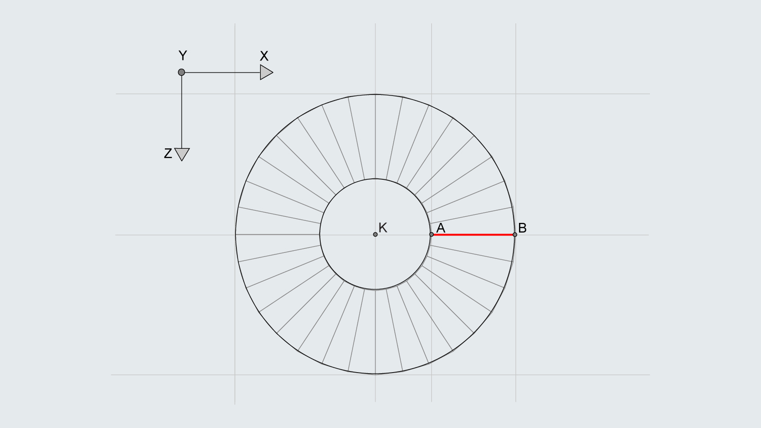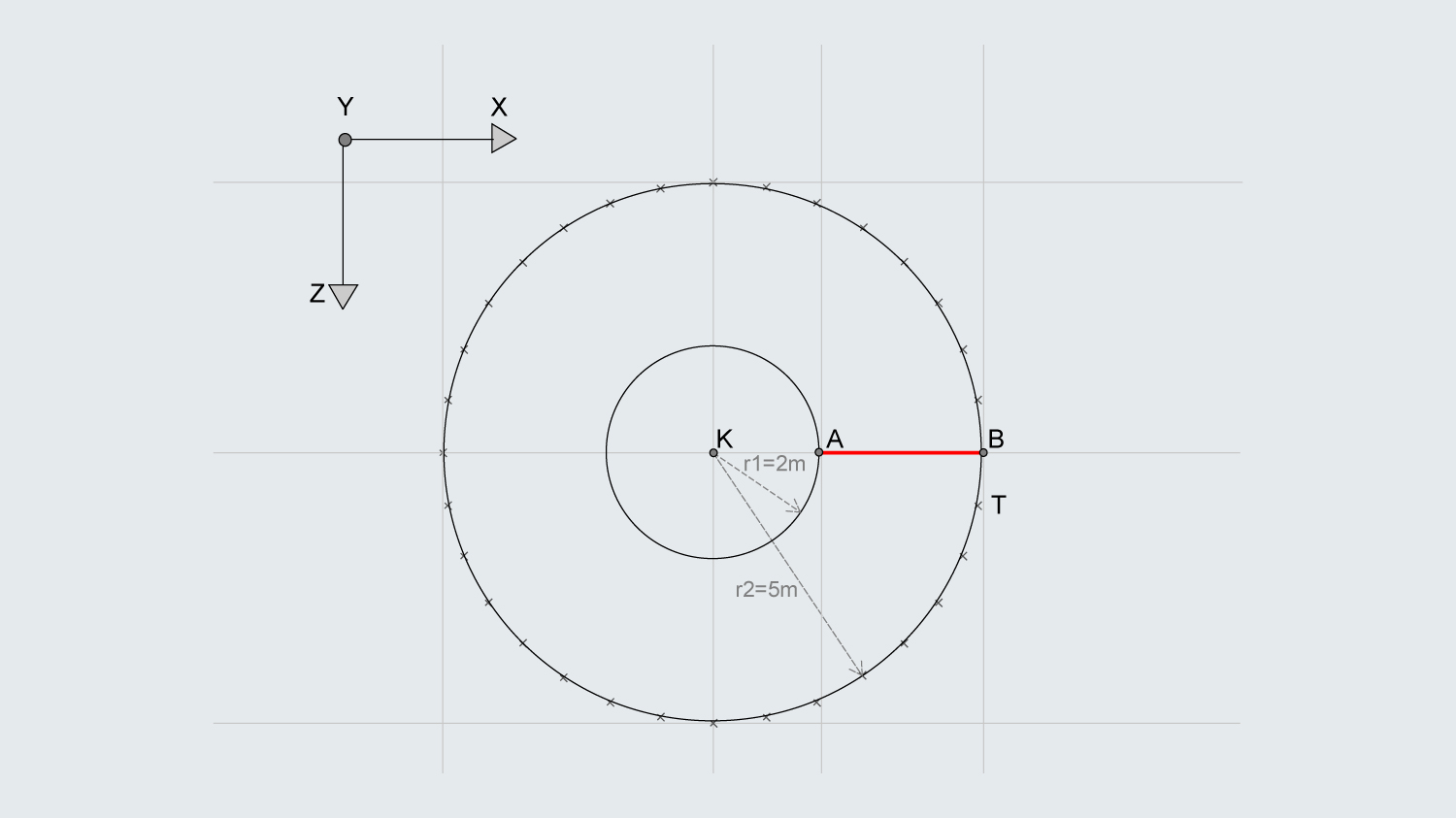 «Κέντρο& Ακτίνα» της οντότητας «Τόξο» σχεδιάζουμε στο επίπεδο ΧΖ 2 ομόκεντρους κύκλους με κέντρο Κ και ακτίνες ΚΑ=2μ, ΚΒ=5μ - Εν συνεχεία, χρησιμοποιώντας την εντολή