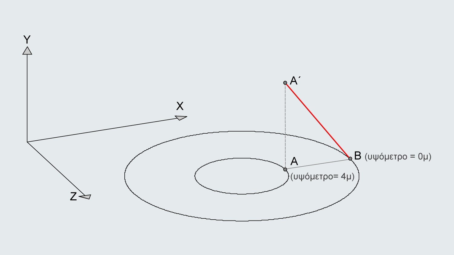 «Κίνηση άκρου καθ’ ύψος». Επιλέγουμε τη γραμμή ΑΒ και στη συνέχεια το άκρο Α αυτής. Στο παράθυρο διαλόγου που εμφανίζεται δίνουμε το νέο υψόμετρο στο σημείο πληκτρολογώντας το ζητούμενο ύψος του κώνου = 4,00 (μ). Με την ολοκλήρωση της διαδικασίας το άκρο Α της γραμμής ΑΒ θα βρίσκεται πια στη θέση Α’ στο χώρο, όπως φαίνεται στο Σχήμα 2.