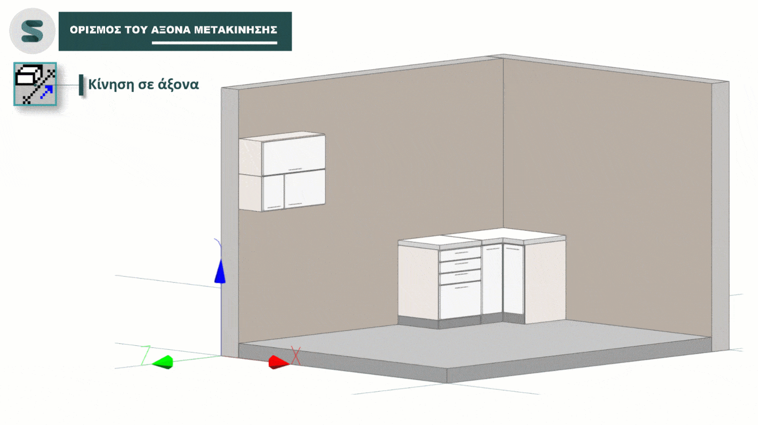 Με τον τρόπο αυτό μπορείτε να  “κλειδώσετε” την κίνησή κατά μήκος μιας ακμής ενός ντουλαπιού κουζίνας (Υ) και να επιλέξετε το κατάλληλο σημείο του πάγκου (Χ, Ζ) για να το τοποθετήσετε ακριβώς από πάνω του!
