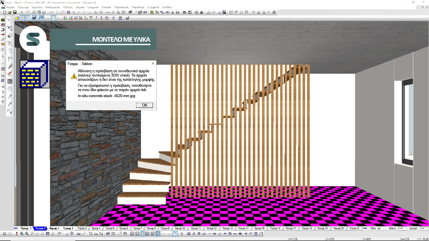 Στην περίπτωση που το αρχείο υφής (= υλικό φωτορεαλισμού) κάποιας επιφάνειας του μοντέλου έχει «χαθεί» τότε κατά την ενεργοποίηση του «Μοντέλου με υλικά», επιπλέον του σχετικού προειδοποιητικού μηνύματος, αντικαθίσταται αυτόματα από το αρχείο υφής «σκακιέρα» με όνομα missing texture.bmp. Έτσι γίνεται εύκολα και γρήγορα αντιληπτό στο χρήστη το ποιες επιφάνειες έχουν επηρεαστεί.