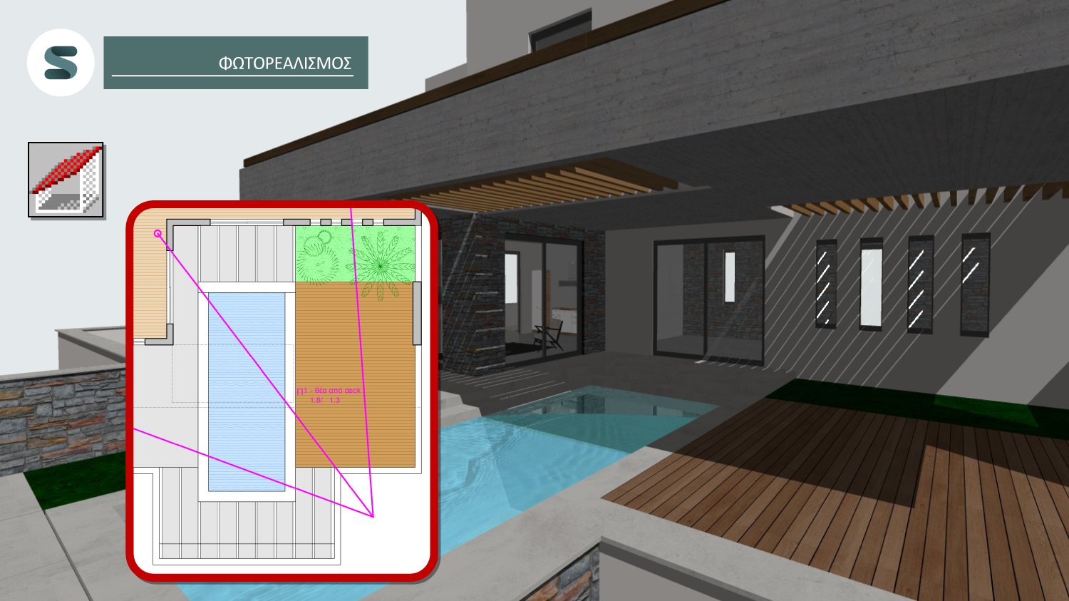 Με δυνατότητα αυτόματης παραγωγής φωτορεαλιστικής απεικόνισης από το 3D περιβάλλον. Μετά την παραγωγή παραμένει στην κάτοψη παρατηρητής από τον οποίο μπορείτε να ανακαλέσετε το συγκεκριμένο view.
