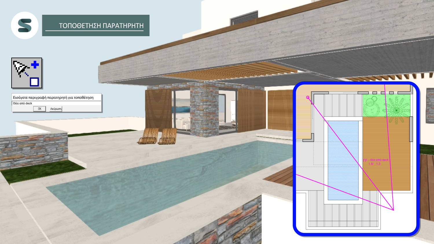 Με δυνατότητα τοποθέτησης παρατηρητή από το 3D περιβάλλον στην κάτοψη ώστε να μπορείτε να ανακαλείτε το συγκεκριμένο 3D view.